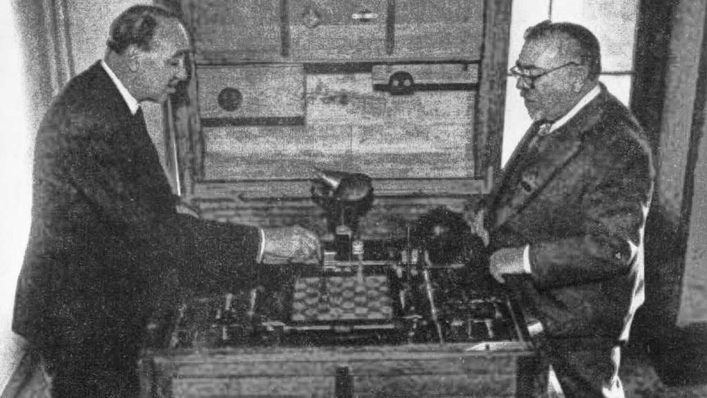 El Ajedrecista: the first computer game in history. Norbert Wiener (right), the father of cybernetics—the science studying communication and control in machines and living beings—is shown observing the pioneering chess automaton created by Leonardo Torres Quevedo, here demonstrated by his son at the 1951 Paris Cybernetic Conference. Image credit: Wikimedia Commons